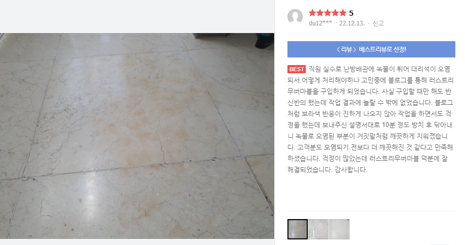 | 천연대리석 얼룩 제거 오염 제거 셀프 광택 내기 광 얼룩 제거 광택 복원 (0) | 2022.07.12 |