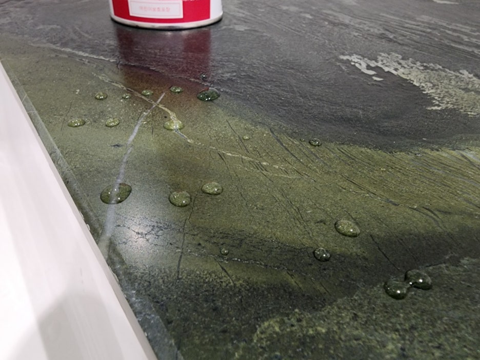 천연대리석 발수 오염방지 코팅 영상입니다. 작업 후에 물이 스며들지 않고, 표면에서 굴러다니게 됩니다