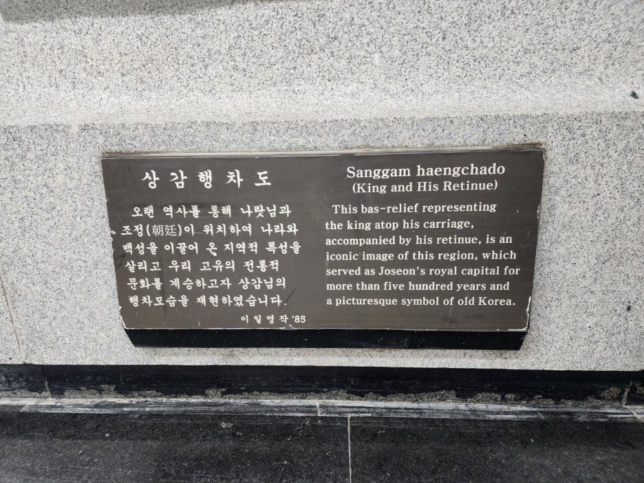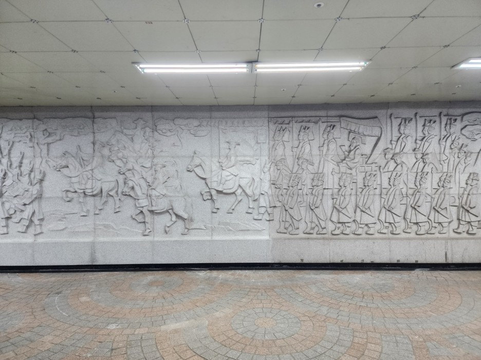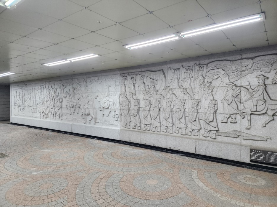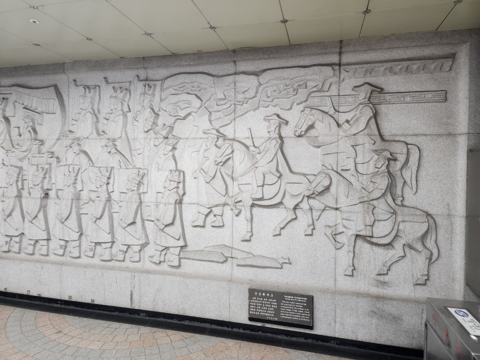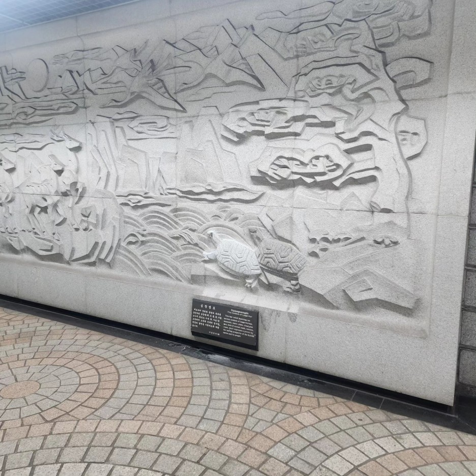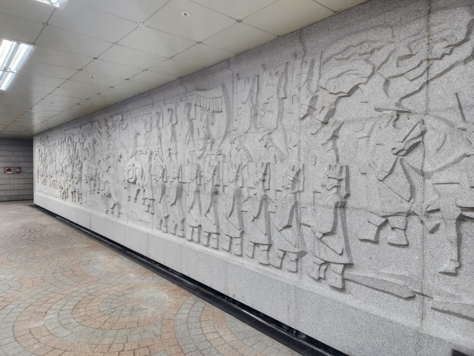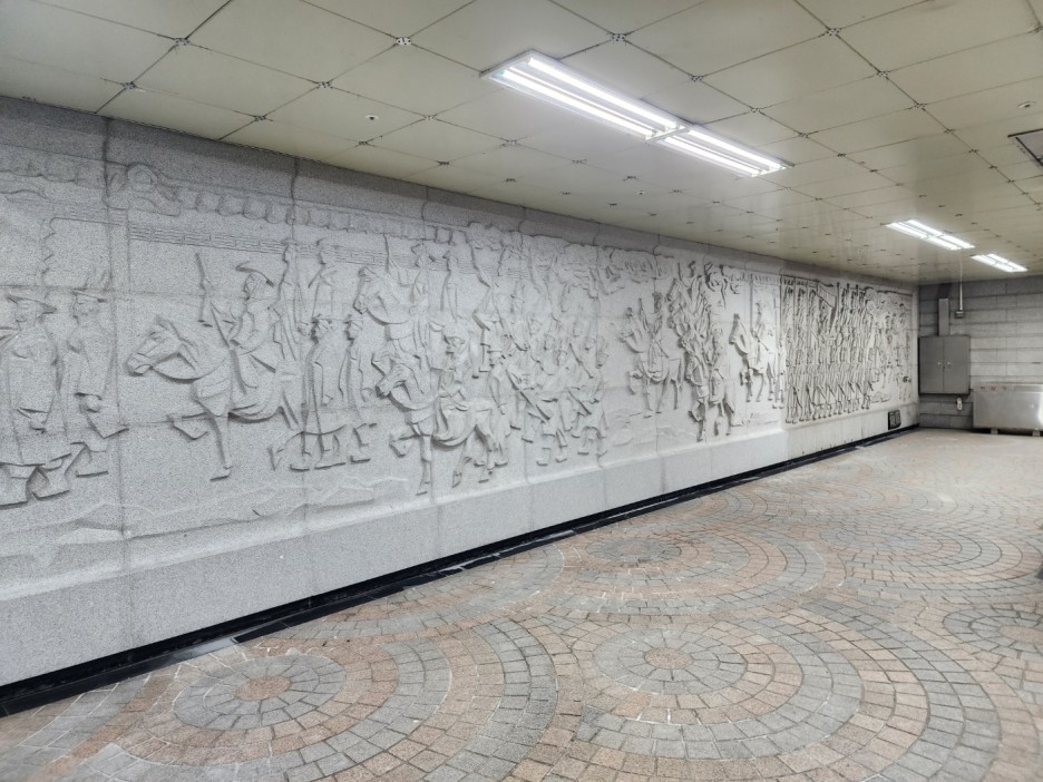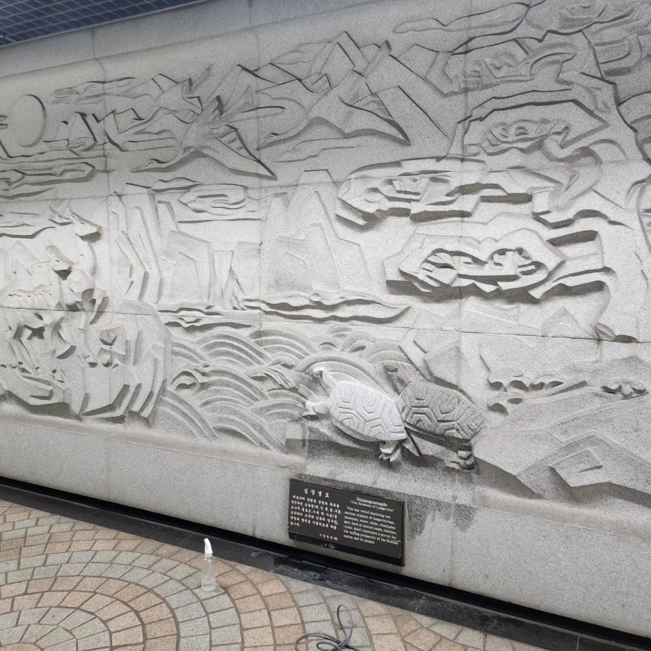 벽에 화강석으로 설치된 조각 벽화가
