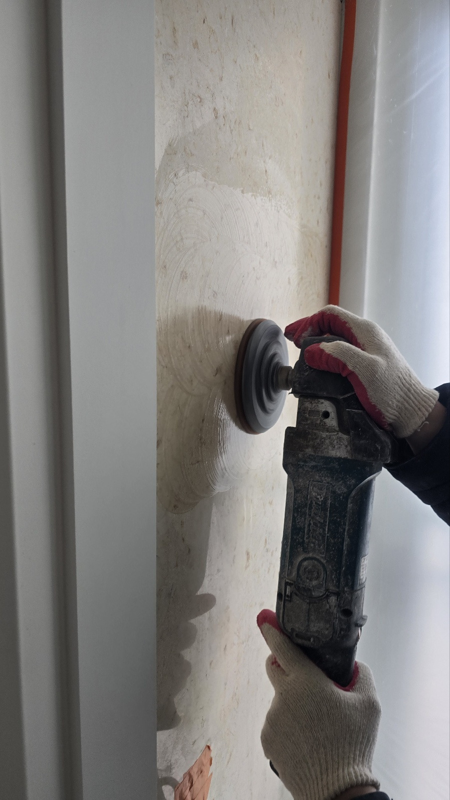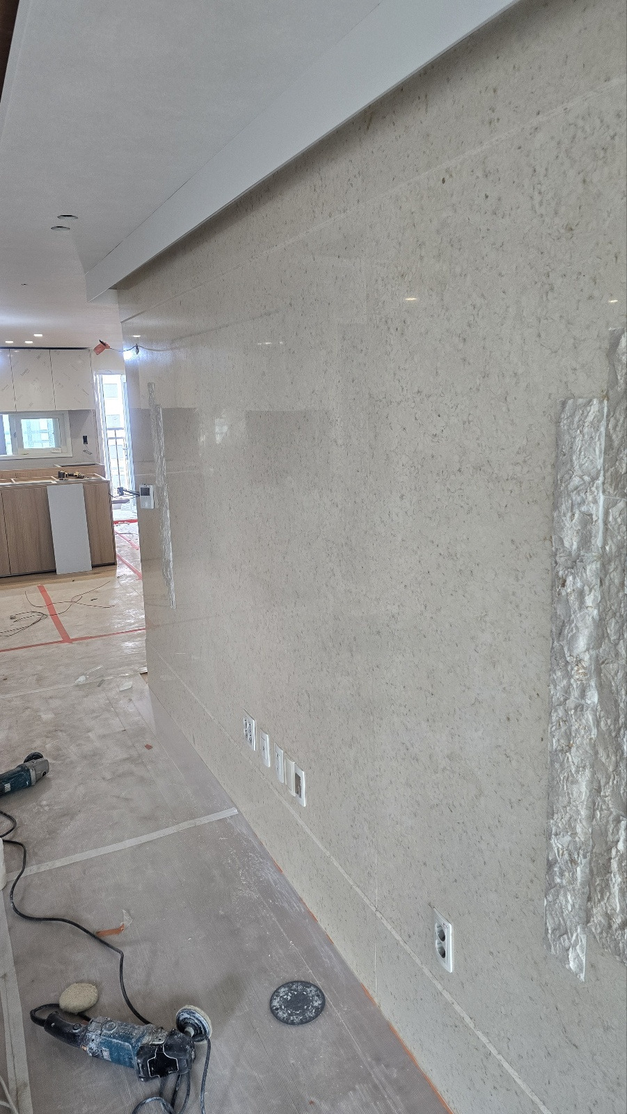 시공되어 있는 벽체 연마광택 복원 작업입니다!